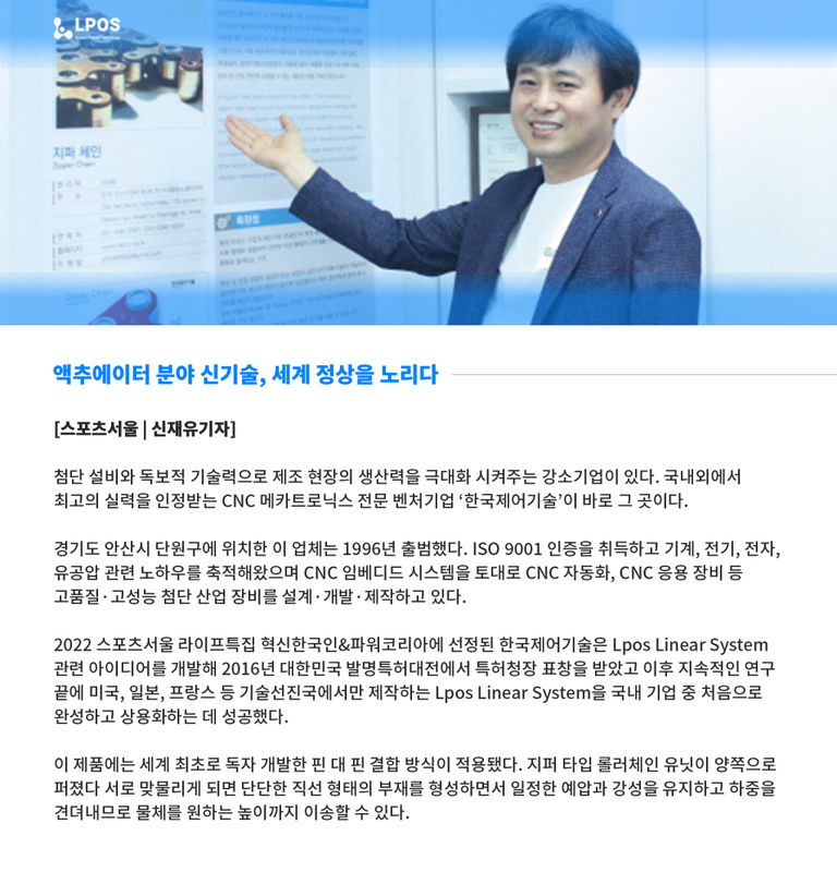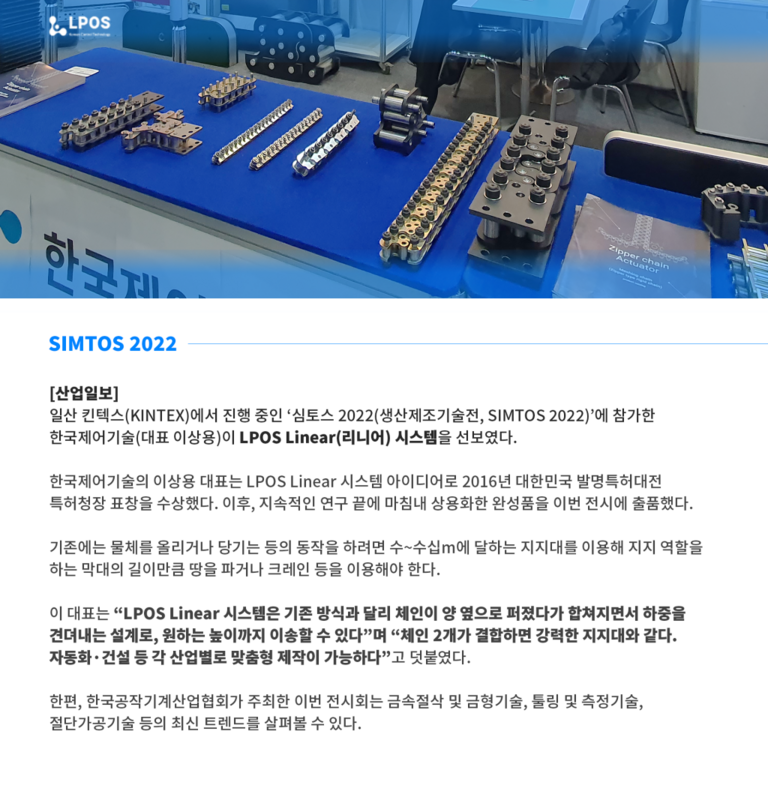 L-pos Rigid chainL-pos rigid chain 은 높은 기능의 선형작동기 체인 기술입니다.선형작동기: 체인을 이용한 수직 운동을 하는 액추에이터 LPOS 소식 리지드 체인 자동 추천 시스템 (어떤 체인이 필요하신가요? 조건을 입력하면 즉시 추천해 드립니다.) 스포츠서울 기사 [액추에이터분야 신기술 세계정상을 노리다] 한국제어기술 TV 방송 [L POS chain 한국제어기술] SIMTOS 2022 [발명 아이디어를 현실로 만들다] 한국제어기술 한국제어기술[L-pos] 카탈로그 파일 입니다. 한국제어기술[L-pos] 카탈로그 파일 입니다. SIMTOS 2022 [발명 아이디어를 현실로 만들다] 한국제어기술 TV 방송 [L POS chain 한국제어기술] L-pos chainLPOS의 소식과 공지사항을 확인하실 수 있습니다.View More 주요고객사